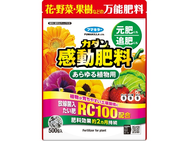 ○有効成分:N:P:K=9:9:9●肥料タイプ:元肥、追肥。●あらゆる植物に使用できる万能肥料。●土壌環境を改善する放線菌入たい肥RC100配合。●肥料効果約2ヵ月持続*。*植物の種類や生育状況、栽培環境によっては肥効期間は異なります。