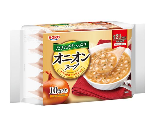 2種類のたまねぎ(ダイス状たまねぎ・ソテーオニオン)使用。たまねぎのシャキシャキ食感と甘味をお楽しみいただけます。ナチュラルチーズとソテーオニオンのコクを感じられるフリーズドライ製法のオニオンスープです。お湯を注ぐだけで簡単に召し上がりいただけます。中国で製造しています。