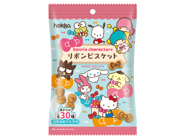サンリオビスケットから平袋サイズが新登場。北海道牛乳を使用した優しい味わいのリボン型ビスケットです。お子様のおやつにもおすすめ。