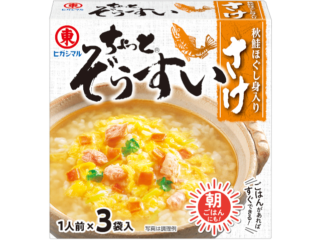 ごはんと一緒に煮込むだけで、手軽にぞうすいが作れます。具には鮭のほぐし身を使用しています。かつおと昆布のだしが焼き鮭の香ばしい旨みを引き立てます。