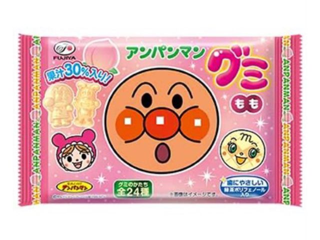 もも果汁を30%配合した、歯にやさしい緑茶ポリフェノール入りのアンパンマントレーグミです。