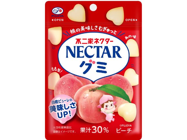 ネクターピーチ味のもも型単層グミです。賑やかな「ももぺこ」の3種パッケージです。