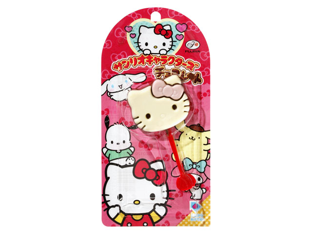 人気の駄菓子です。3種のチョコレートで人気のサンリオキャラクターの顔を表現した、棒付きチョコレート。