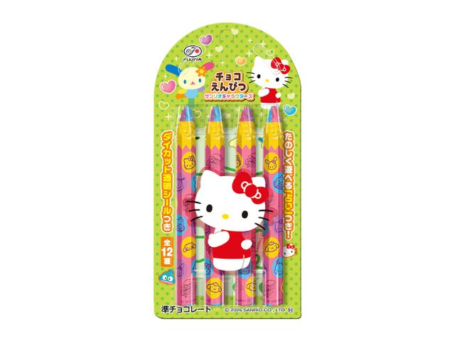 手に持って食べやすい、アルミ個装のえんぴつ型チョコレートです。サンリオキャラクターズの可愛いシールが選べる4本チョコえんぴつ。