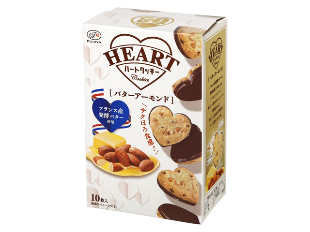 サクッとほどけるようなホロホロ食感のアーモンドクッキーとチョコレートを組み合わせた味も形も楽しめる「ハート型クッキー」です。フランス産発酵バターとクラッシュアーモンドを配合しバターのコク深い風味です。
