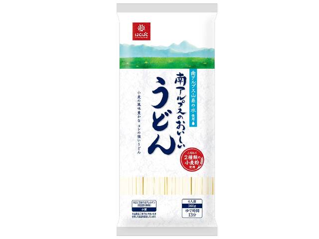 「南アルプス」をイメージした新たな産地推し乾麺。南アルプス山系の水を使用し、山梨県南アルプス市で製造した乾麺です。小麦の風味豊かなコシの強いうどんです。