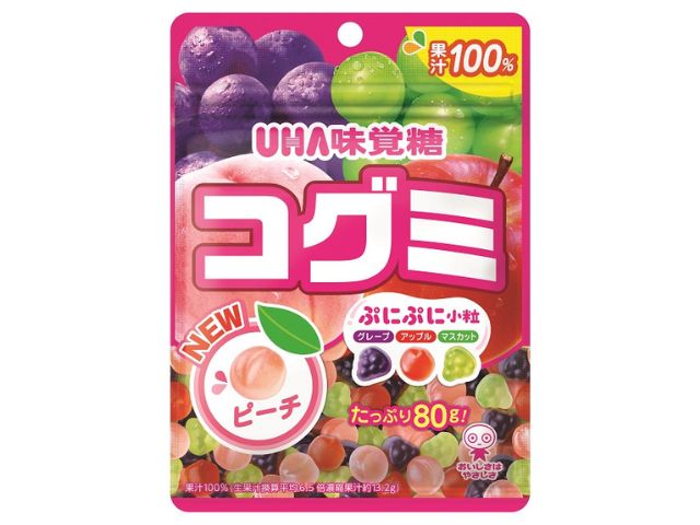 果汁100%!ぷにぷに小粒フルーツアソートグミです。人気のピーチ味が仲間入りしました。1粒ずつ食べてもおいしい、他の味と一緒にミックスして食べてもおいしい、フルーティな味わいです。果汁100%のフルーツアソートグミグレープ・マスカット・アップル・ピーチ4種のフルーツアソートグミ。4種の味を楽しめ、さらに果汁100%の濃厚な果汁感を楽しめるグミに仕上げました。