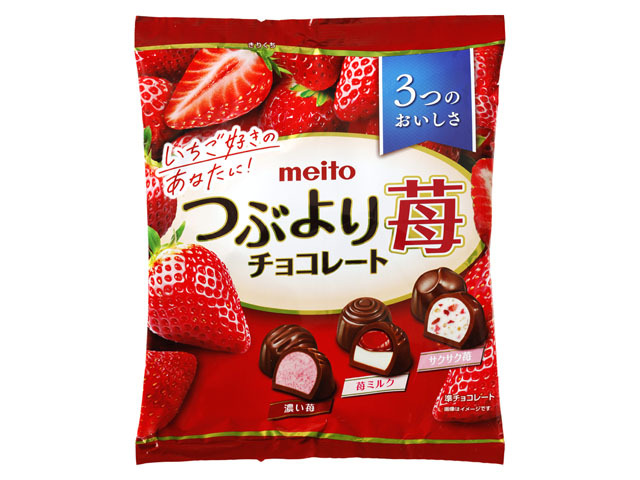 3種類の異なる風味食感で食べ応えのある大粒の苺チョコレートです。社名が名糖産業(株)から(株)meitoへ変更になりました。
