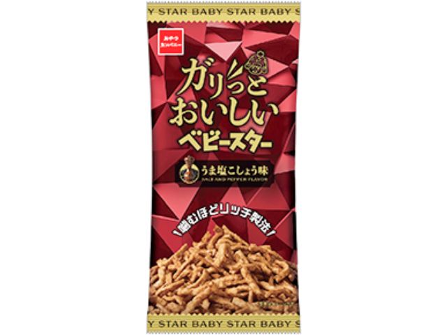 鱈の身を生地に練り込むことで、ガリッとした固め食感と噛むほどに素材の旨みが広がるリッチな味わいを実現。スパイシーな黒こしょうと鱈の旨みを楽しめる、おつまみにもおすすめな一味違ったベビースターです。