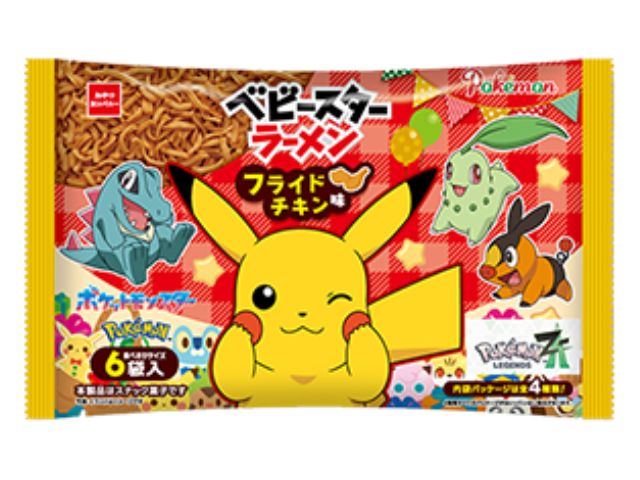 パッケージにポケモンたちが登場!パーティーにもぴったりなフライドチキン味のベビースターラーメンです。みんなでシェアできる食べきりサイズ6袋入り。