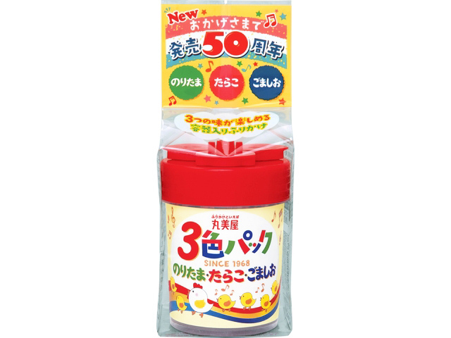 丸美屋だけのオリジナル容器に<のりたま><たらこ><ごましお>の3つの人気のおいしさを詰め合わせました。卓上に置いておけるスタイリッシュさと、3種類のふりかけを選ぶ楽しさを兼ね備えた、人気の商品です。容器の色は、赤、青、黄色の3種類。