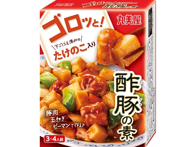 豚肉・ピーマン・玉ねぎで作る、ゴロッと大きなたけのこがセットになった酢豚の素です。