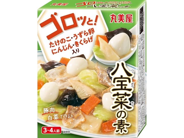 豚肉・白菜で作る、ゴロっと大きなたけのこ・うずら卵・にんじん・きくらげがセットになった八宝菜の素です。