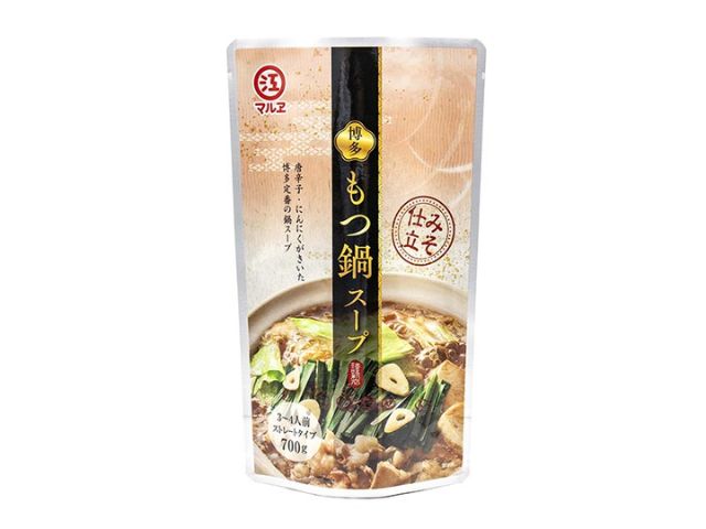 唐辛子とにんにくをきかせた味噌ベースの博多もつ鍋スープです。博多自慢のもつ鍋がおいしく手軽にご家庭で味わえます。ピリッと辛味のきいた味で、食材のおいしさを引き立てます。