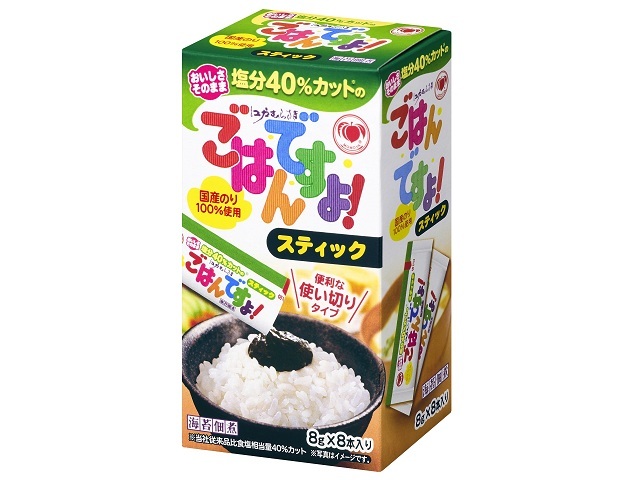 びん詰商品「塩分40%カットのごはんですよ!」のトロ〜りとしたおいしさそのままに、使い切りサイズ(1本8g入り)のスティックタイプ(個包装)にしました。1食分ずつ小分けされたスティック包装の食べ切りサイズですので、衛生的で長期保存にも適しています。常温保存商品のため、そのまま食卓に置いておくことが出来、食べたいときにすぐにご使用いただけます。携帯に便利な小箱入りですが、個包装のみでも持ち運べますので、お弁当のお供やアウトドアなど、さまざまなシーンでご利用いただけます。