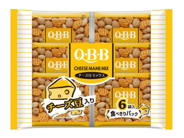 QBBチーズパウダーを使用したチーズ豆と、ピーナッツ、豆菓子、チーズ味六角スナックをミックスしました。食べきりサイズの小袋6パックを1袋にしました。