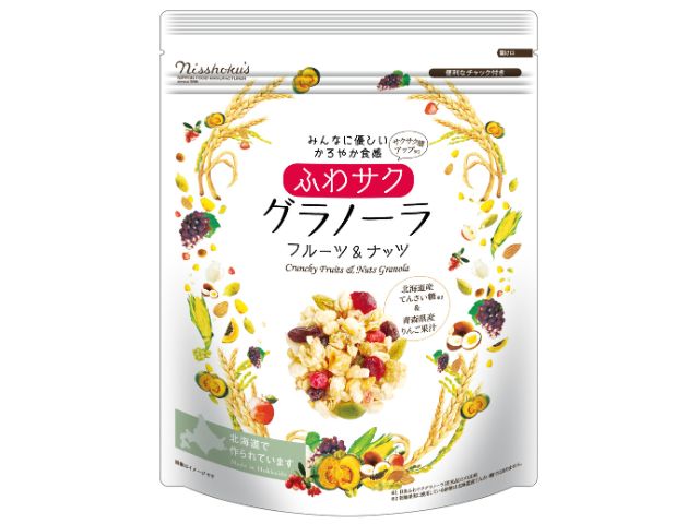 「みんなに優しいかろやか食感」のフルーツ&ナッツグラノーラです。食感が硬いグラノーライはお子様やご年配の方には敬遠されることもありました。日食のふわサクフルーツ&ナッツグラノーラは、お子様やご年配の方にも楽しんでいただけるように、軽やかな食感とやさしい甘さを両立させた「みんなに優しい 」グラノーラです。