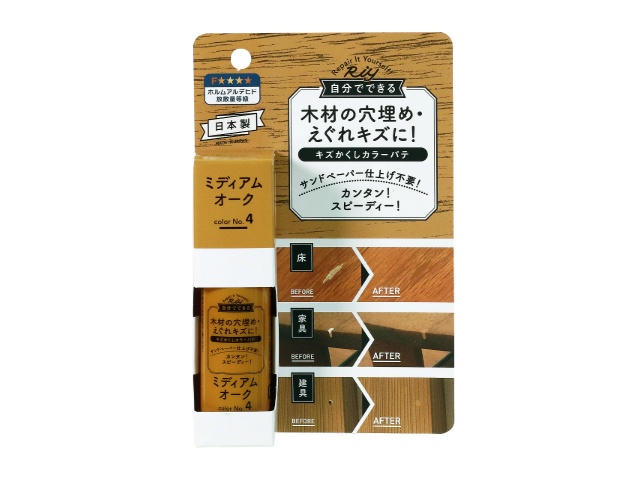 床、家具、建具の木材の穴埋、ひび割れに。補修する箇所に注入し付属のヘラで成型するだけ。面倒な着色作業はいりません。ノズル付きチューブなので、細かい箇所も補修可能。