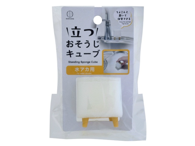 キューブ型のクリーナー。ポリエステル不織布付き。水アカを落とせます。キッチンや洗面台の水アカなど、水回りの掃除に。4本の脚付き。自立します。キッチンのシンクや洗面台などに、ちょこんと立てて保管できます。立てて置くと通気性がよく、衛生的に保管できます。