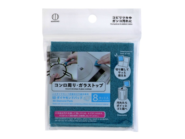 ・人工ダイヤモンド研磨材付の不織布を使用したお掃除パッド。・8カット入。切れ目がついているので、手でちぎって切り離して、サッと使えます。・キッチンのコンロ周りのガンコ汚れや、ガラストップのコビリツキ汚れに。・洗面台、浴室などの掃除に。・使い捨てタイプ。汚れたらポイッとゴミ箱へ。※本品は汚れを削って落とすため、キズがつきます。キズがついて困るも場所には使用しないでください。