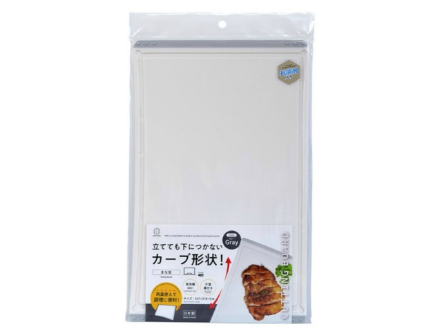 立てても下につかないカーブ形状。汁のしたたり防止の片面溝付き。両面使えて調理に便利。食洗機可。抗菌剤付き。四隅にすべり止め付き。