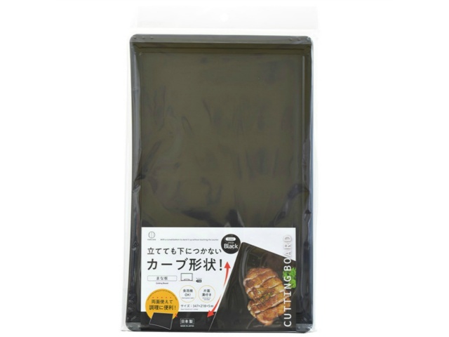 立てても下につかないカーブ形状。汁のしたたり防止の片面溝付き。両面使えて調理に便利。食洗機可。抗菌剤付き。四隅にすべり止め付き。