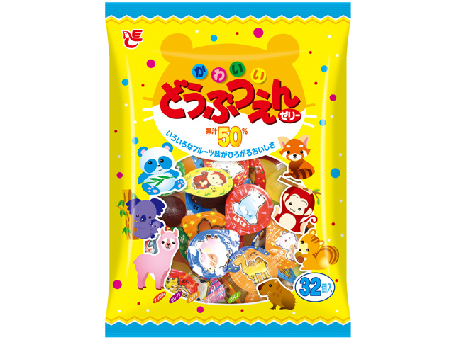 どうぶつのイラストがかわいい、アップル、グレープ、オレンジ、パイン、ピーチの5つの味の果汁50%(生果汁換算比)ゼリーです。
