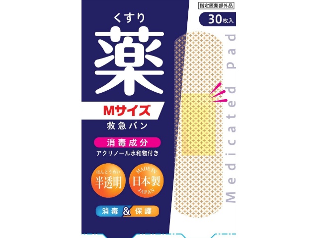 消毒成分のアクリノール水和物をパッドに含有しているため、傷口を消毒しながら保護できる救急ばんそうこうです。傷に直接あたるパッドも傷口にひっつきにくい特殊パッドを使用しています。