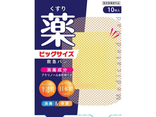 消毒成分のアクリノール水和物をパッドに含有しているため、傷口を消毒しながら保護できる救急ばんそうこうです。傷に直接あたるパッドも傷口にひっつきにくい特殊パッドを使用しています。