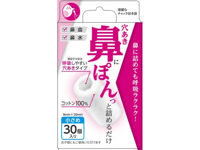 鼻ぽんの中心部に穴が空いており、呼吸しやすい特殊形状で、両鼻に使用しても呼吸でき、鼻の穴に入れるだけで誰でも簡単に鼻血、鼻水の止血、吸収に使用できるコットン100%の日本製