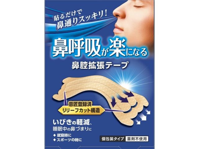 いびきの軽減・睡眠中の鼻づまり(就寝時)やスポーツの時に、鼻に貼るだけで鼻腔が拡げられ鼻呼吸が楽になります。