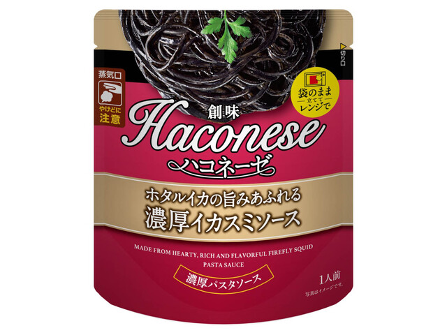 ホタルイカと完熟トマトとイカスミの濃厚な旨みが特徴です。たっぷりのホタルイカから旨みをふんだんに引き出し完熟トマトイカスミで仕上げた濃厚パスタソースです。