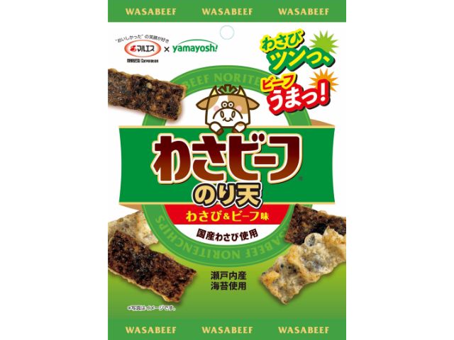 山芳製菓株式会社の人気商品「わさビーフ」とのコラボレーション商品です。国産の海苔をキャノーラ油でサクッとフライし、わさびが効いた濃厚ビーフ味に仕上げました。