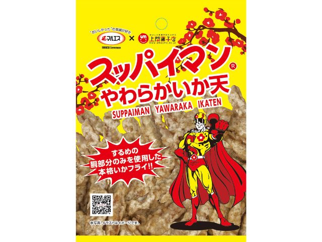 人気のお菓子「スッパイマン」と弊社人気商品「やわらかいかフライ」のコラボレーション商品です。するめの胴部分のみをキャノーラ油でフライしました。スッパイマン特有の甘酸っぱさがいかフライと相性ピッタリです。