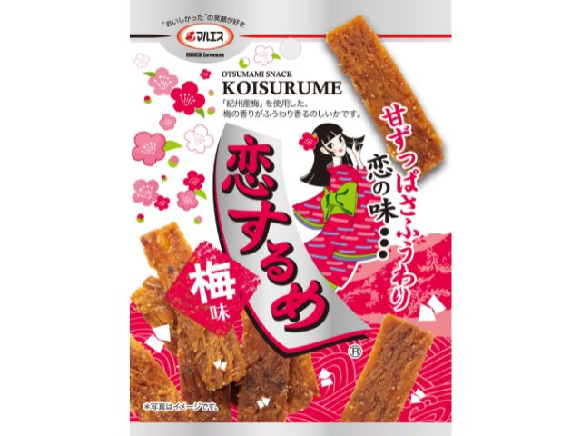 マルエスの大人気商品「恋するめ」を甘酸っぱい梅味に仕上げました。現行のあまから味の美味しさをそのままに、ほのかな酸味と梅の香りが口いっぱいに広がる逸品です。甘くてちょっぴり刺激的な恋の味をお楽しみください。