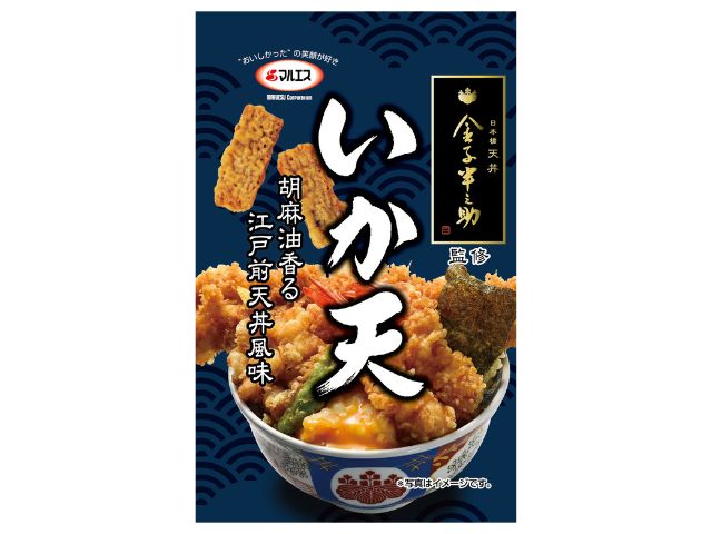 江戸前天丼で有名な「日本橋天丼金子半之助」とのコラボレーション商品です。するめの胴部分のみを使用し、キャノーラ油100%でサクッと揚げた一口サイズのいか天を金子半之助監修の下、胡麻油香る江戸前天丼風味です。
