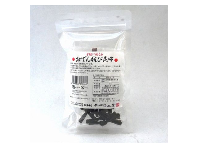 サオ前昆布を一つ結びにしました。柔らかく煮上がるので、煮しめのお料理やおでんに入れてお召し上がり下さい。水で戻していただくと簡単に煮上がります。缶に入れて保存して頂くのが最適です。