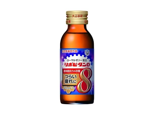 リポビタンD8は、タウリン1500mg、ローヤルゼリー500mgにビタミンB1・B2・B6など計8種類の有効成分を配合した、100mLドリンク剤です。
