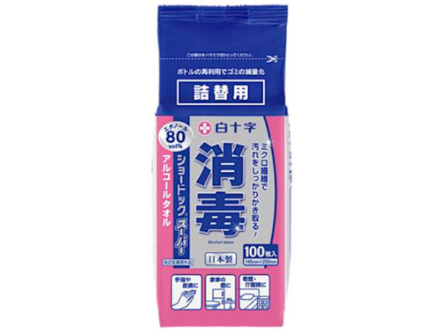 エタノール76.9-81.4vol%の消毒用のアルコールタオル。ミクロ繊維ですっきりふき取り、手指やテーブル・キッチンまわりの消毒、感染対策にもオススメです。詰替えタイプ。
