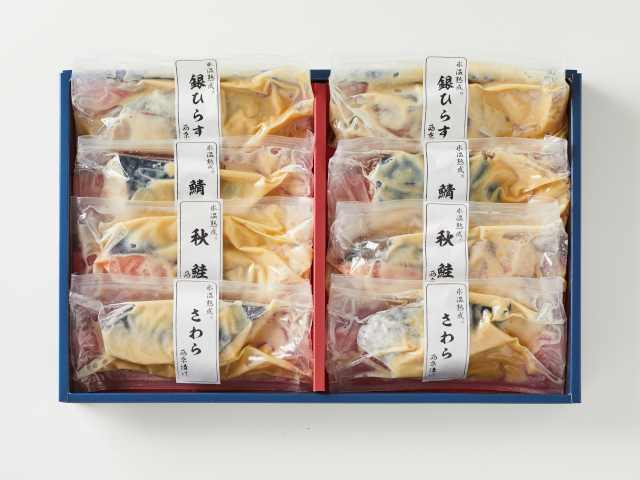 0℃以下、氷結点までの温度帯で加工・熟成する山陰・鳥取発祥の技術『氷温熟成法』によって魚の鮮度を損なう事無く旨みを引き出しました。バラエティ豊かな4種類の魚をまろやかな甘さの味噌床にじっくり漬け込んだ一品です。真空パックの個別包装で保存性も良く、焼くだけで手軽にお召上がり頂けます。柔らかな身から溢れ出す魚の旨みと、身の隅々まで染み渡った上品な味噌の味の重なりを是非ご賞味下さい。