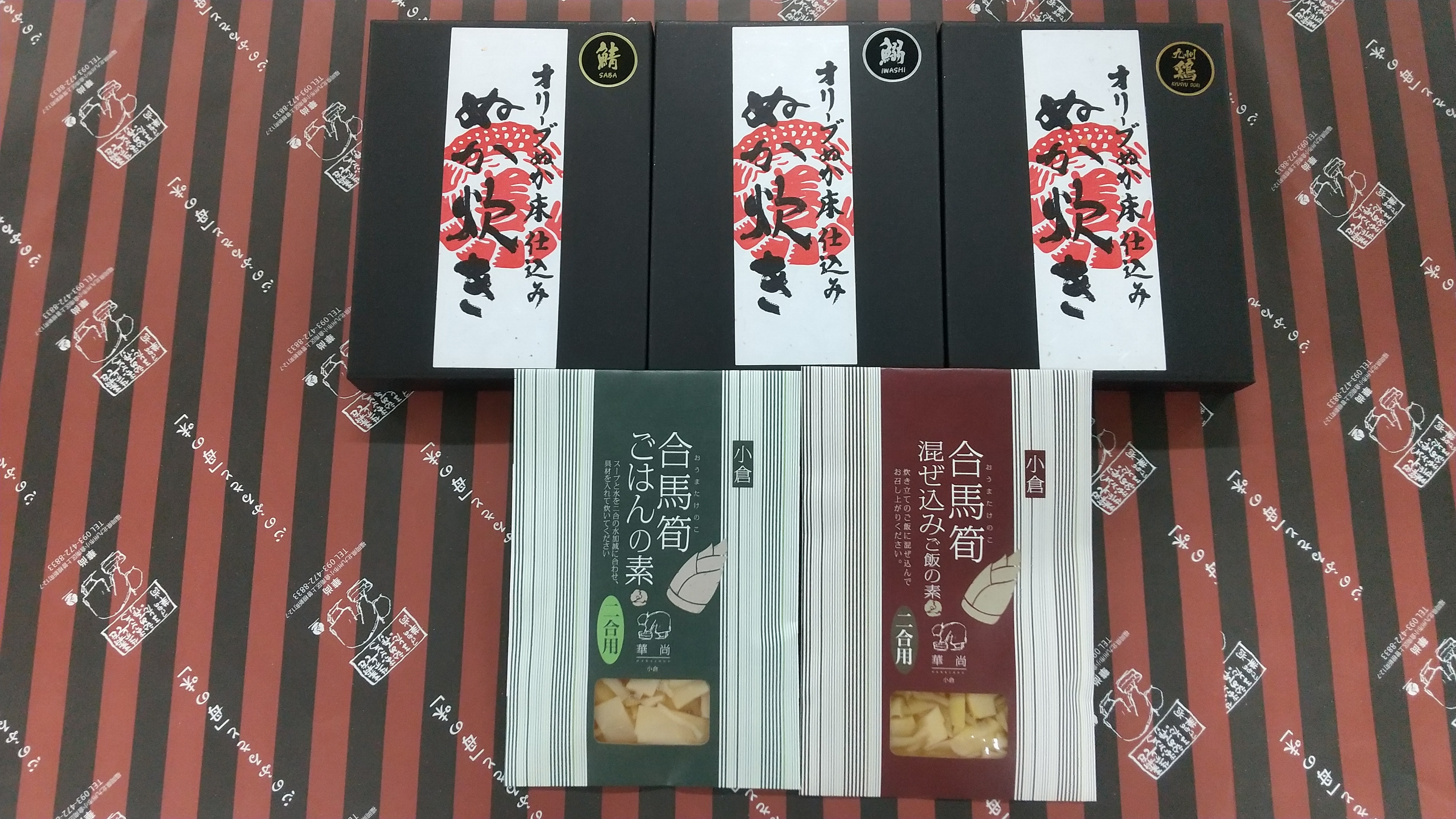 北九州「合馬産」の筍を使用した風味豊かなご飯の素と小倉の郷土料理「ぬか炊き」3種を詰合せました。