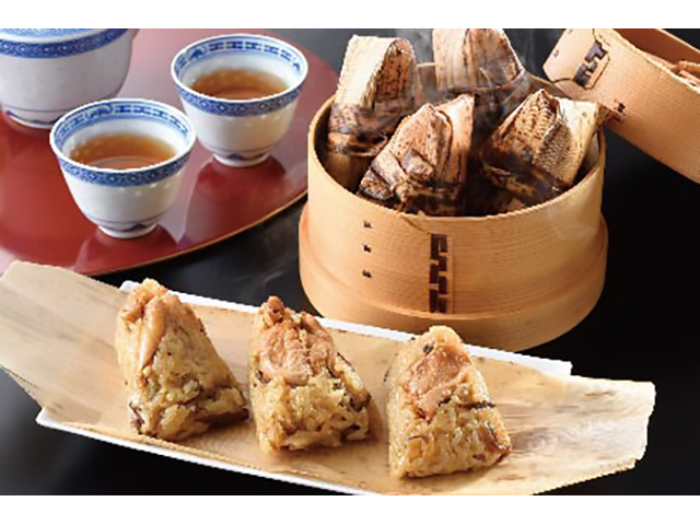 国産のもち米だけをサワラ材のせいろでじっくり蒸し上げ、国産の舞茸を混ぜ込んだおこわに赤鶏の味付け肉をトッピングして、中華ちまきに仕上げました。