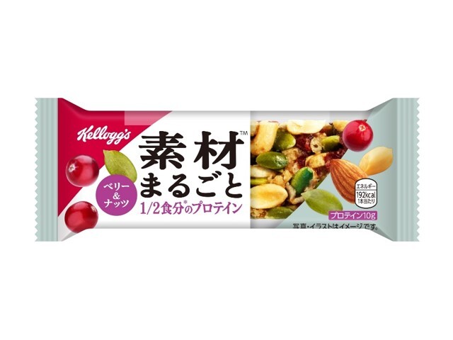 素材の美味しさ、素材の栄養をまるごとお楽しみいただける「素材まるごと」プロテインバーは植物由来のプロテインをたっぷり1/2食分(10g)も配合。ナッツやフルーツなどの具材を可能な限り加工せず使用しています。