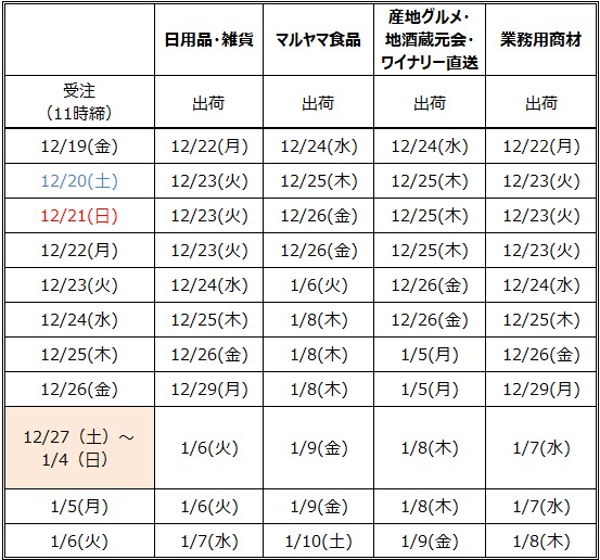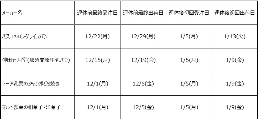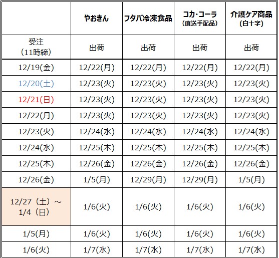 ・連休後初回受注締め日:1月5日11時締め (12月29日午後以降注文可能)